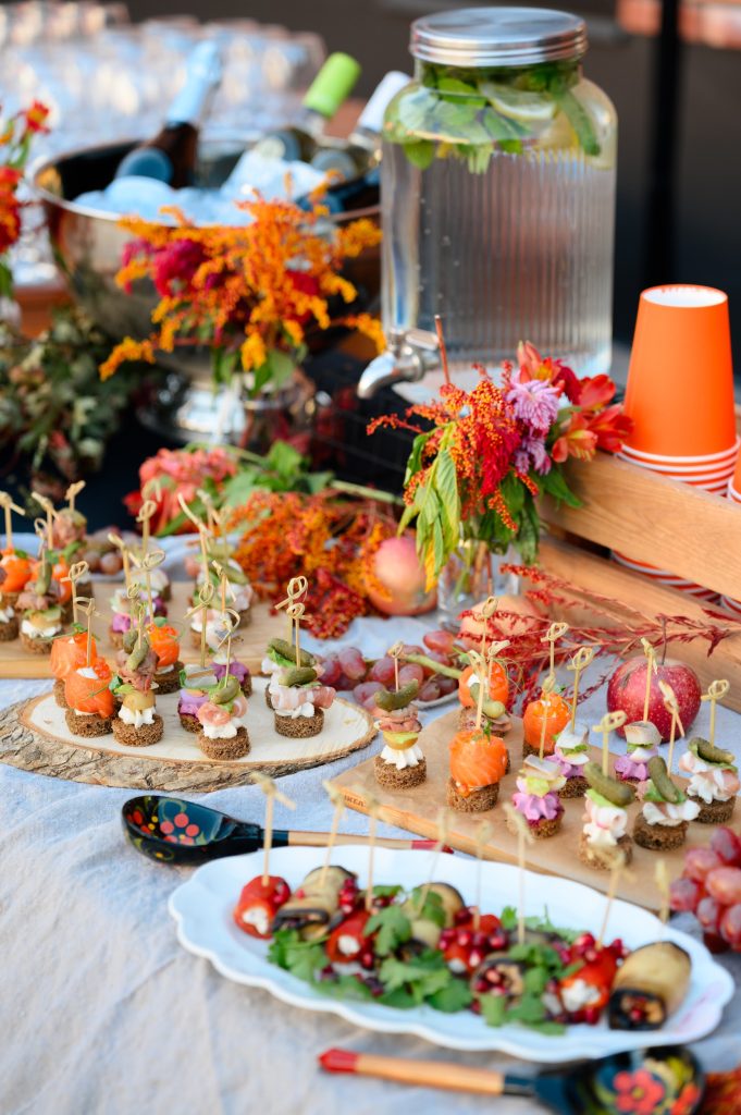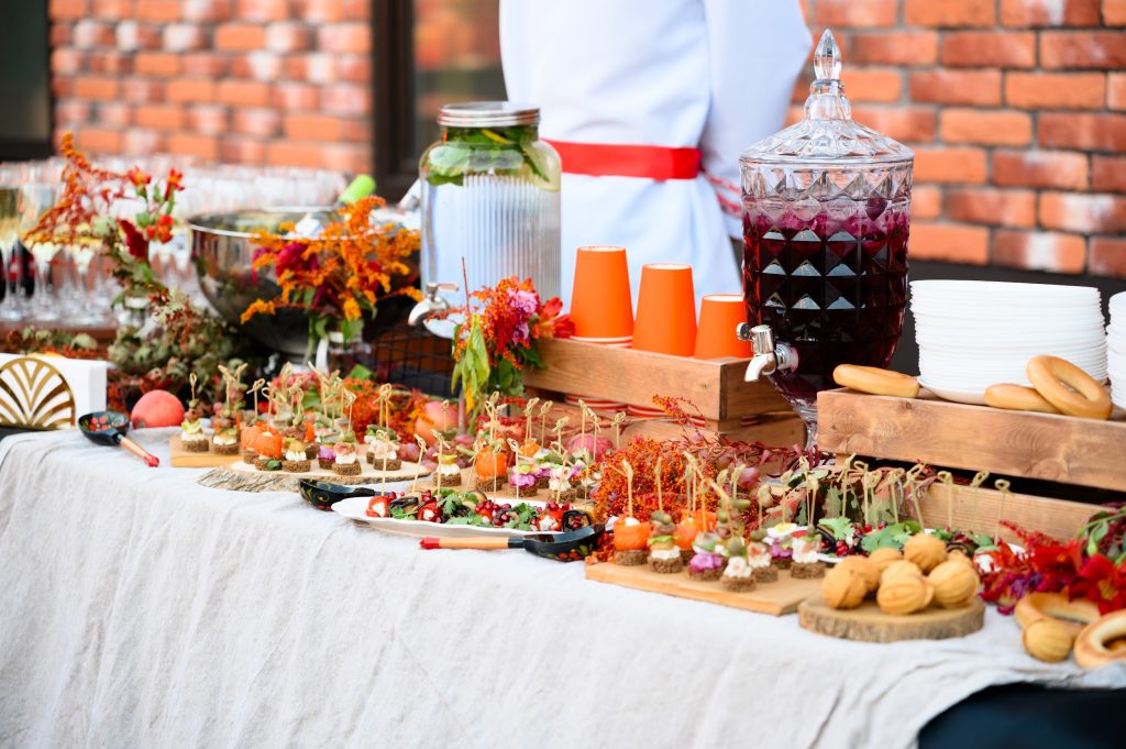 - Кейтеринг и выездной бар: одна из главных зон для гостей это фуршет и выездной бар. Изысканные блюда и разнообразные коктейли – это главная фишка любого праздника.