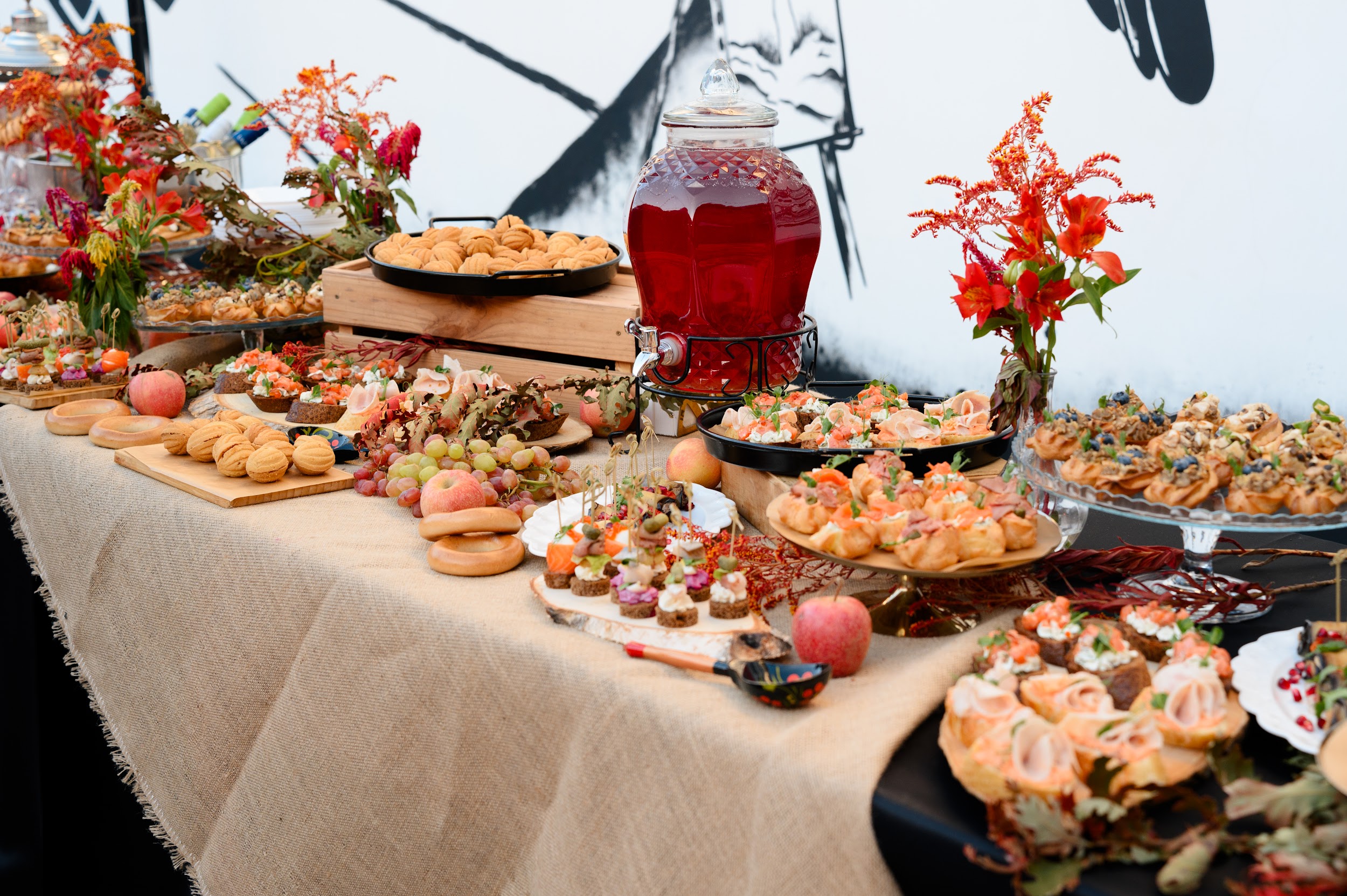 - Кейтеринг и выездной бар: одна из главных зон для гостей это фуршет и выездной бар. Изысканные блюда и разнообразные коктейли – это главная фишка любого праздника.