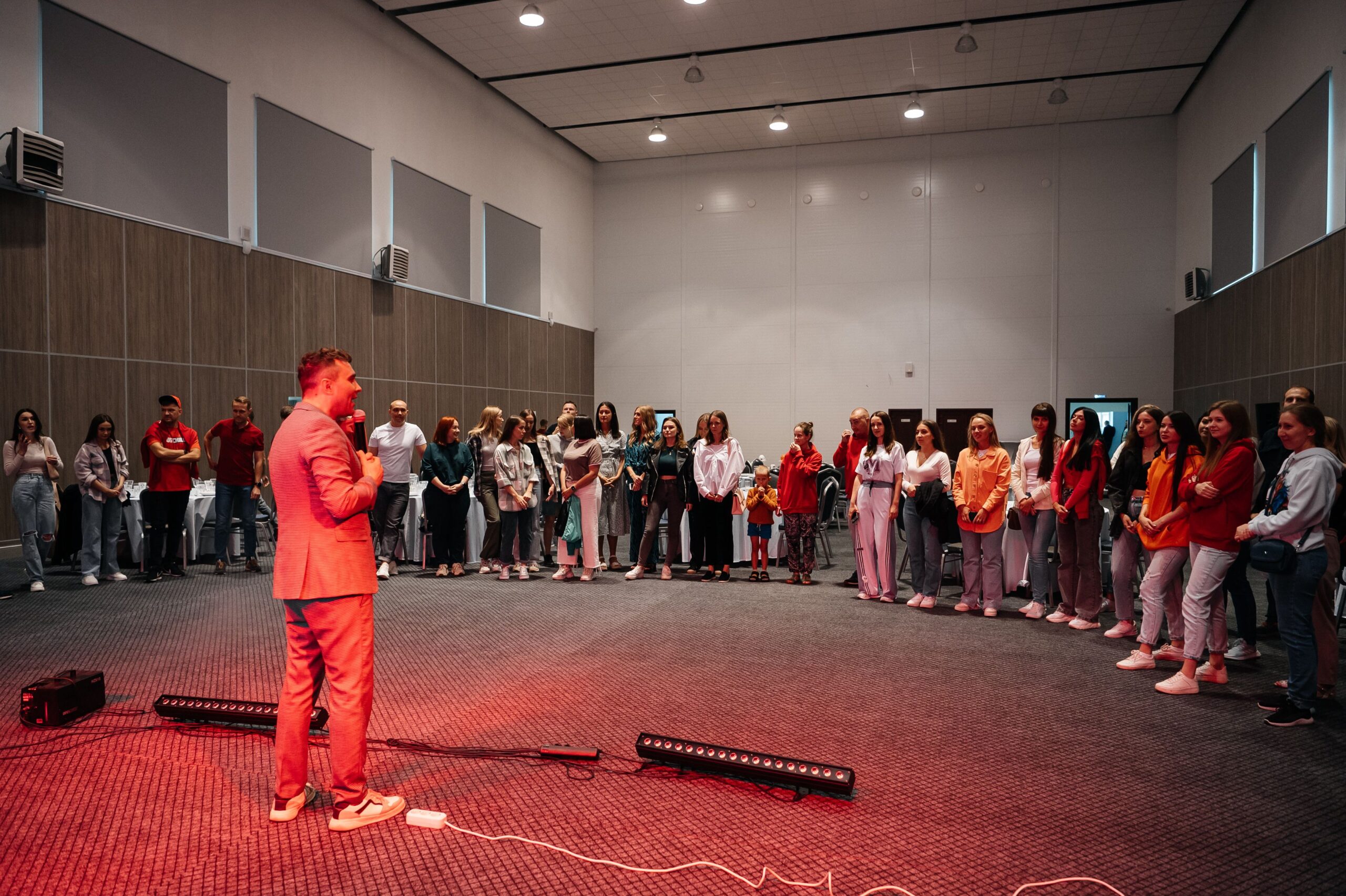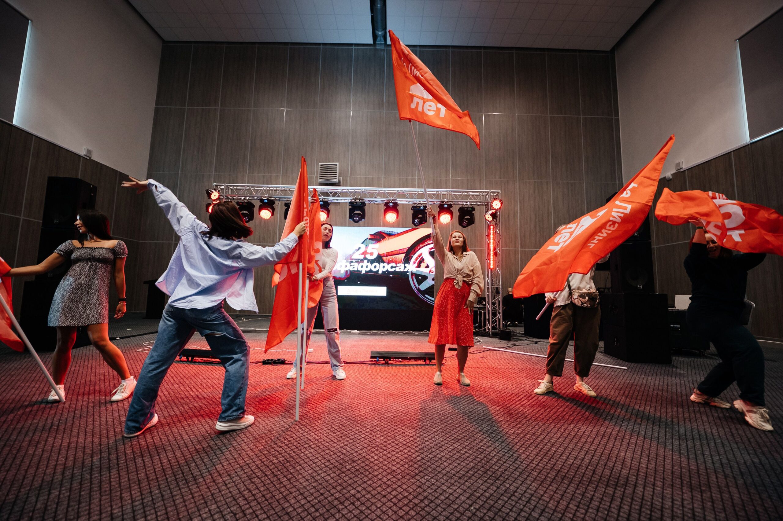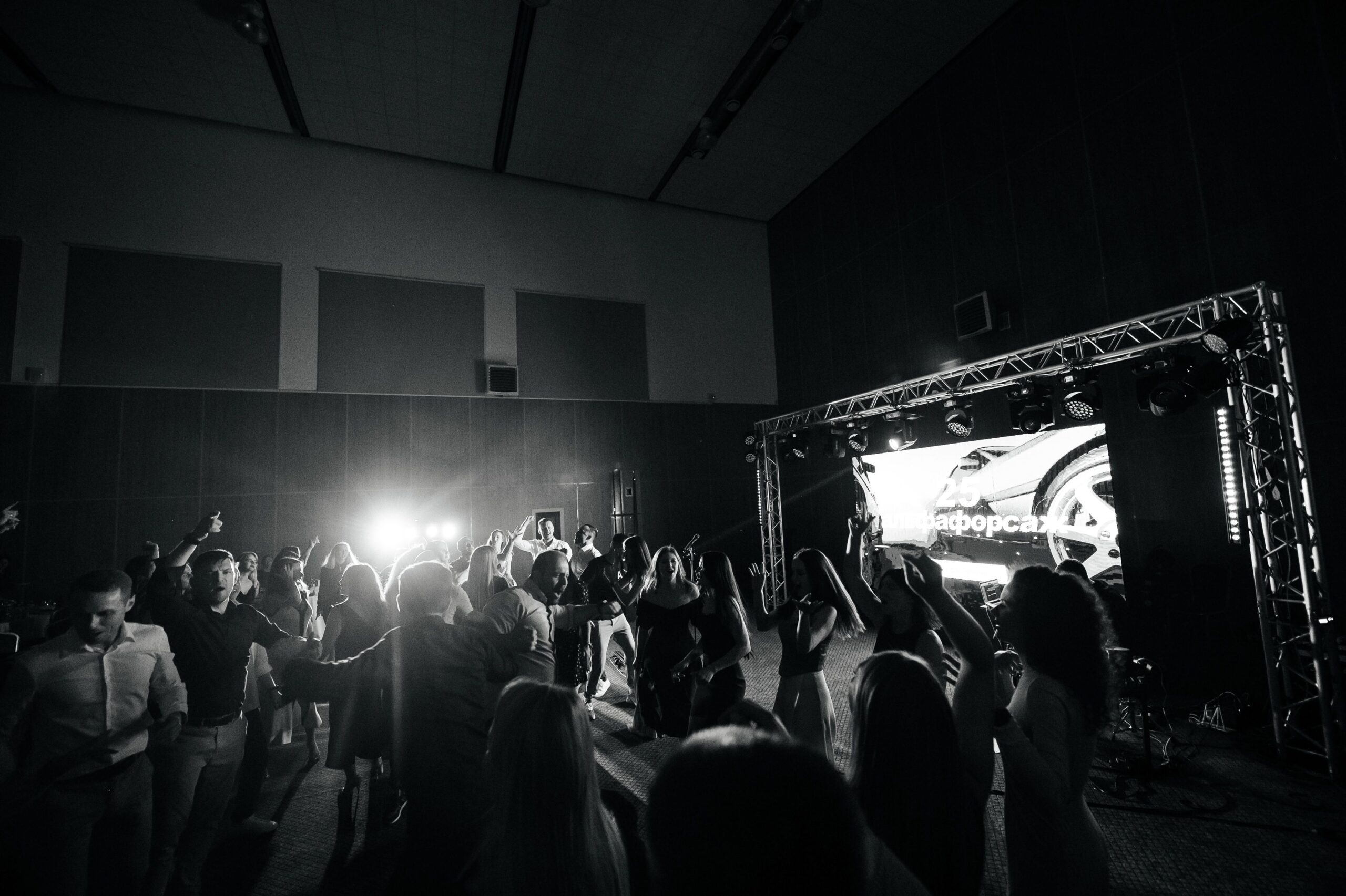 По завершении тимбилдинга и автогонок сотрудники компании отправились готовиться к корпоративной вечеринке. Их ждал настоящий праздник с ведущим и диджеем. Наша команда, ответственная за техническую поддержку, установила впечатляющую П-образную конструкцию с 10 световыми головами Wash и Beam (аренда светового оборудования), а также обеспечила 8 кВт звука и светодиодный экран размером 3.5х2 метра.