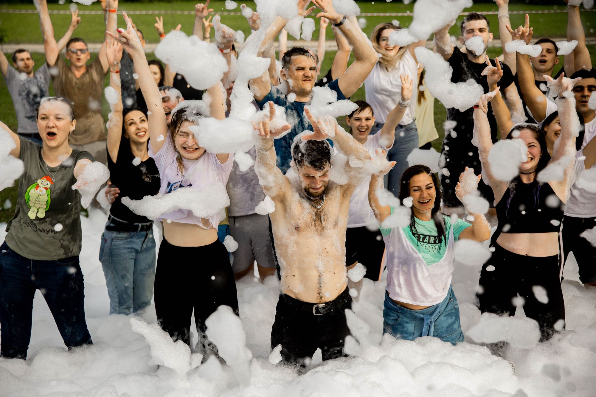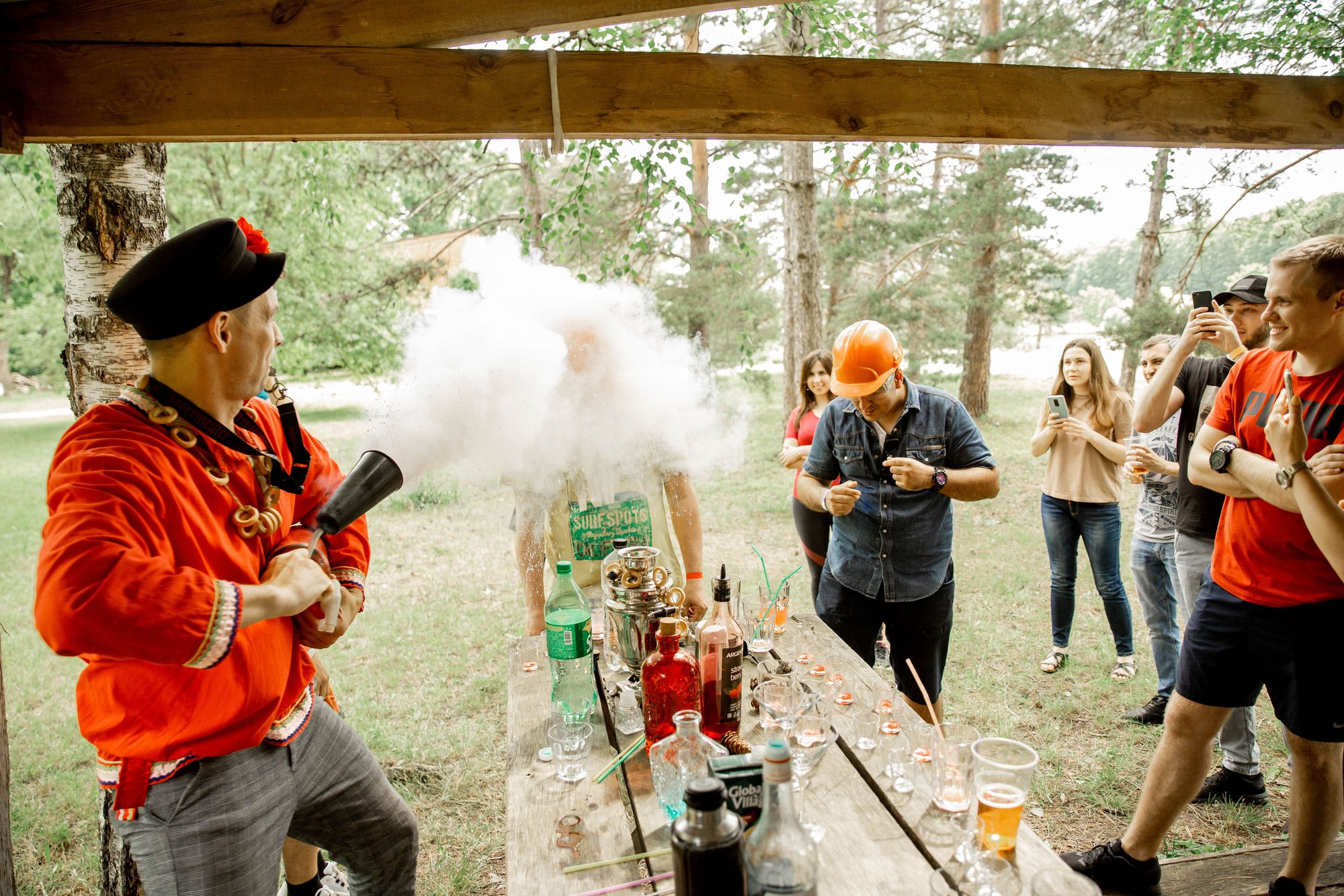 После квеста участники, вымотанные, но эмоционально заряженные, наслаждались обедом, а затем приступили к второй части праздника. Пенная дискотека, мастер-классы по разрисовыванию футболок, хороводы, выездное караоке, бармен и самогонное шоу, а также веселые конкурсы от ведущего Владимира Неволина стали ярким завершением необычного корпоративного мероприятия.